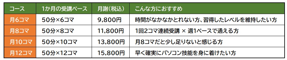 ぴくせるパソコンスクールでは、月あたりの受講回数別に4つのコースを用意しています。また下記月謝の他に入会金11,000円(税込)とそれぞれのコースに応じたテキスト代がかかります。テキスト代は1冊2000円前後とリーズナブルです。設備維持費などその他の費用は一切いただきません。